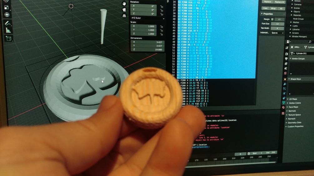 This addon can generate right GCODE with any type of carving drill. You can configure in wide range (sizes, origins, fine, pass) Additionaly you can cut bezier paths.